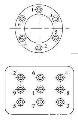 按先中間、后兩邊、對角、順時針方向依次、分階段緊固。