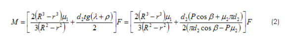 其中:F 表示為預(yù)期預(yù)緊力;M 是螺栓最終的擰緊力矩;d2 為螺紋中徑;P 為螺距;μ1 被連接件與螺母之間的摩擦系數(shù);μ2 為螺紋之間的摩擦系數(shù);β 為螺紋牙形半角;λ為螺紋升角;ρ 為螺栓螺母螺紋之間的摩擦角;R 為螺母支承面外圓半徑;r 為螺母支承面內(nèi)圓半徑。但是實(shí)際工作中如果按照(2)式計(jì)算螺栓的擰緊力矩會(huì)顯得非常麻煩,因此,為了便于實(shí)際工程的計(jì)算,對(duì)(2)進(jìn)行簡(jiǎn)化,最終得到下式: